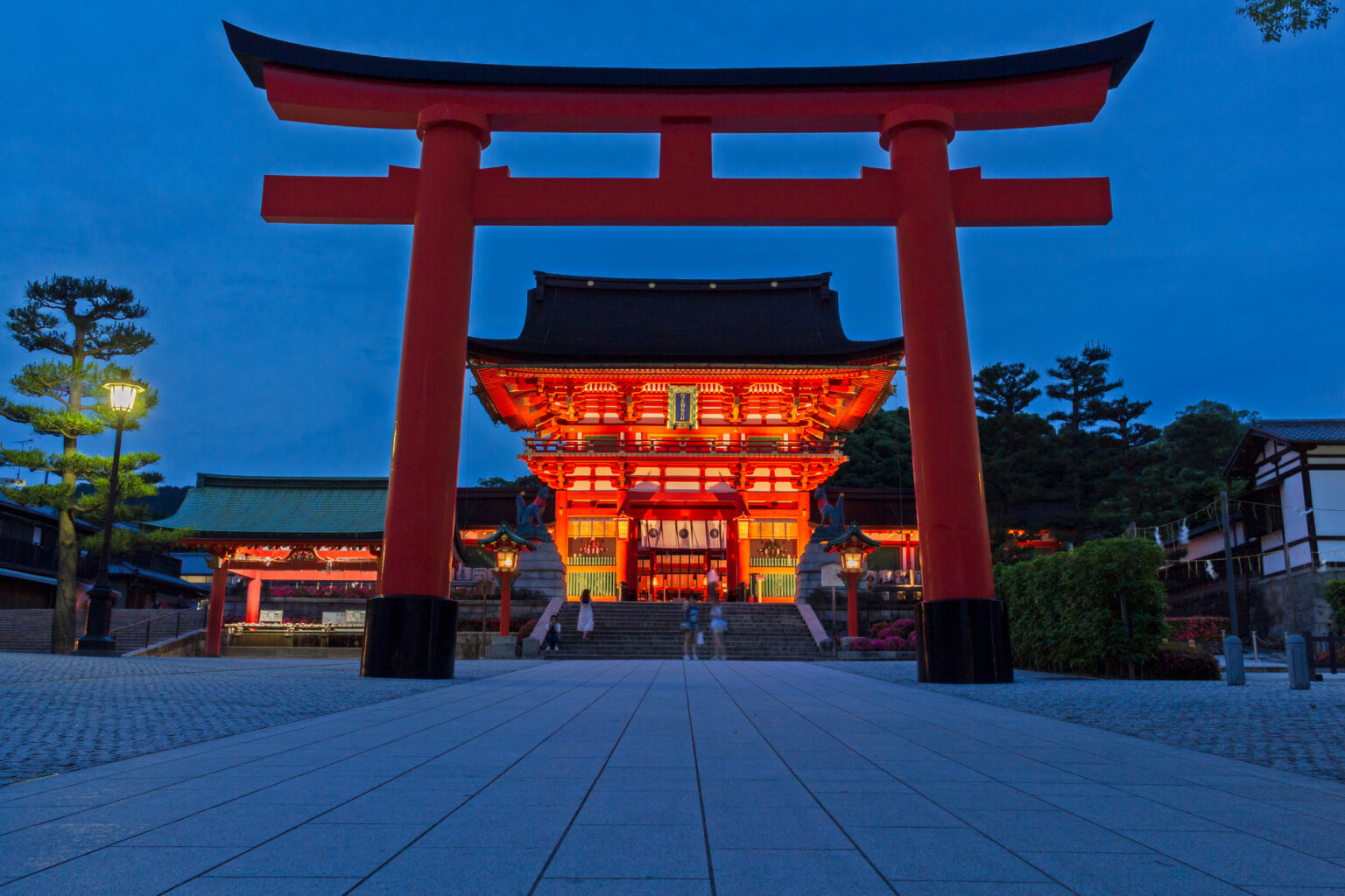 平日のほとんどの日で外国人観光客の方が日本人よりも多くなっており、日没後も稲荷山に登る外国人が多くなっている。なお、本殿付近はライトアップされており、稲荷山への参道も脇道以外は全区間で街灯が一晩中点灯されており夜間の参拝も容易である。